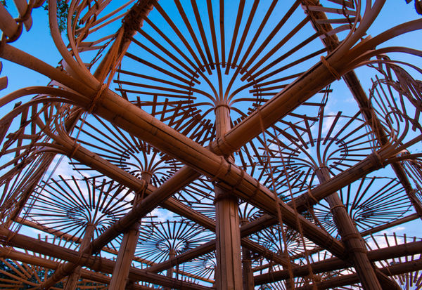 The artist weaves the bamboo strips into numerous umbrella-shaped structures in both 2D and 3D as the firework. The x, y, and z axis of the artwork seem to be independent; however, the bamboo strips are closely woven as one. When the weather changes, it also creates cracking sounds due to the expansion and shrinking caused by temperature.